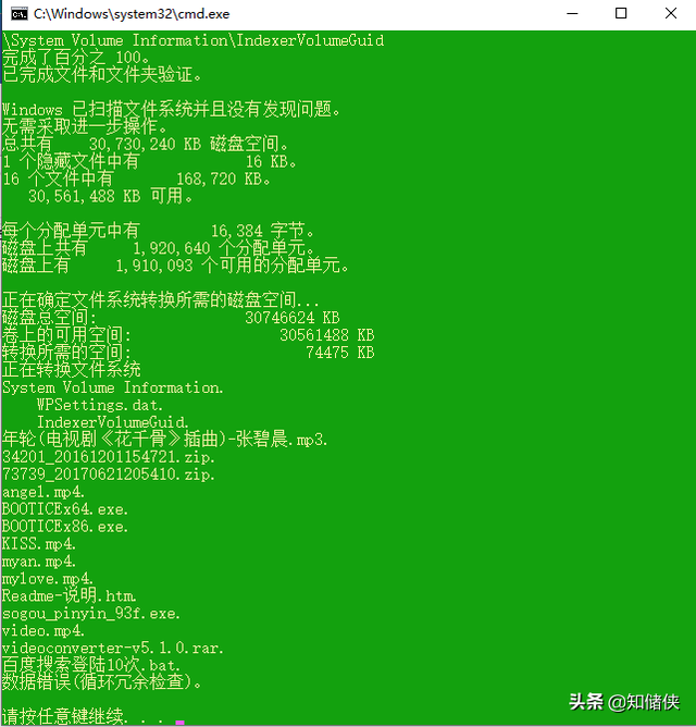 这就是这个BAT运行的详情。我的光威G速时空里,有数据,但是它在FAT转NTFS的过程中不会损坏和删除我原来的数据。