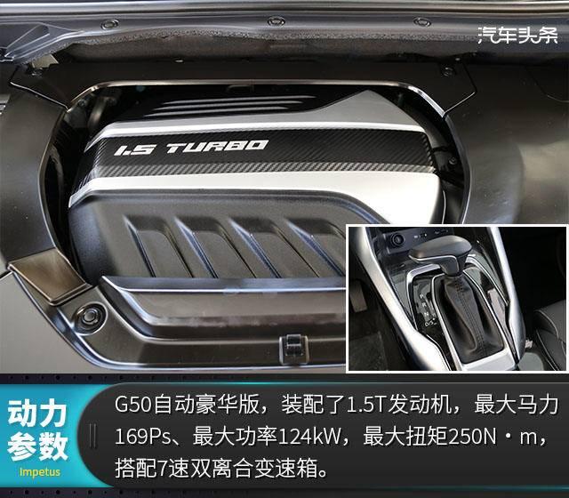 G50搭载了1.3T/1.5T两款发动机,其最大功率分别为111kW和119kW,峰值扭矩分别为220N·m和250N·m,传动方面分别匹配6挡手动或7挡双离合变速器。