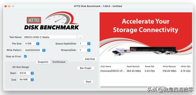 用ATTO DISK BENCHMARK测得数据(4GiB),连续读取:364.45 MB/s,连续写入:318.45 MB/s。