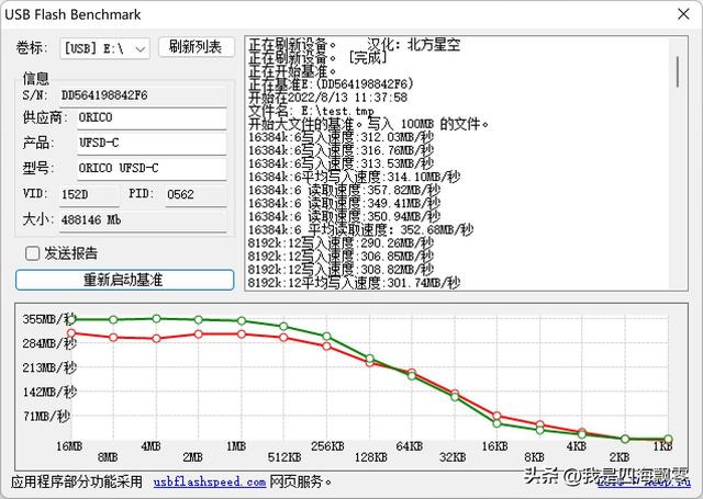 电脑用USB Flash Benchmark测得数据,16MB文件的写入速度:314.10 MB/s,16MB文件的读取速度:352.68 MB/s。