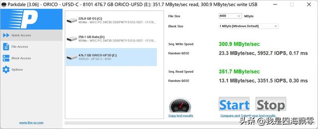 用Parkdale测得数据,连续写入:300.9 MB/s,连续读取:351.7 MB/s。