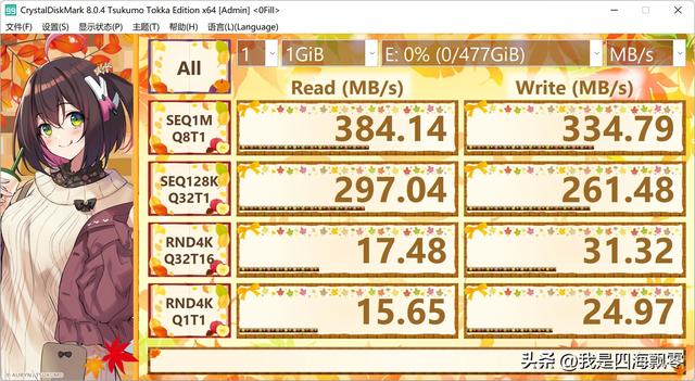用CrystalDiskMark在(默认)下测得数据,连续读取:384.14 MB/s,连续写入:334.79 MB/s。