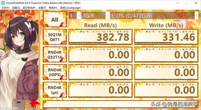 用CrystalDiskMark在(峰值)下测得数据,连续读取:382.78 MB/s,连续写入:331.46 MB/s。