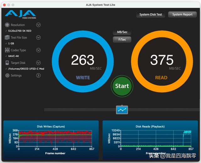 用AJA System Test Lite测得数据(1GB),连续写入:263 MB/s,连续读取:375 MB/s。