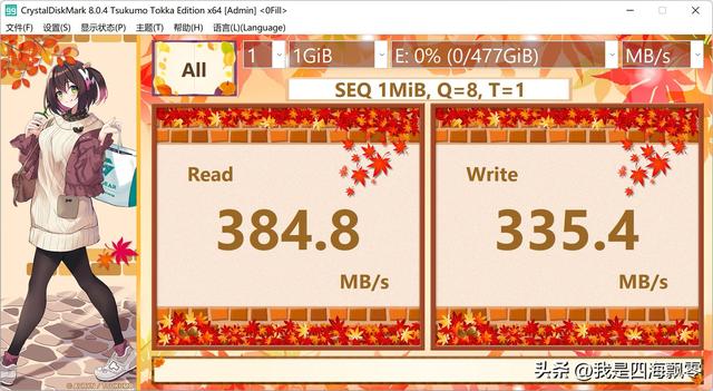 电脑用CrystalDiskMark在(演示)下测得数据,连续读取:384.8 MB/s,连续写入:335.4 MB/s。