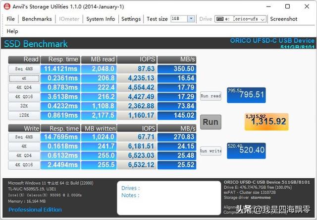 用Anvils Storage Utilities测得数据,连续读取:350.50 MB/s,连续写入:270.83 MB/s。