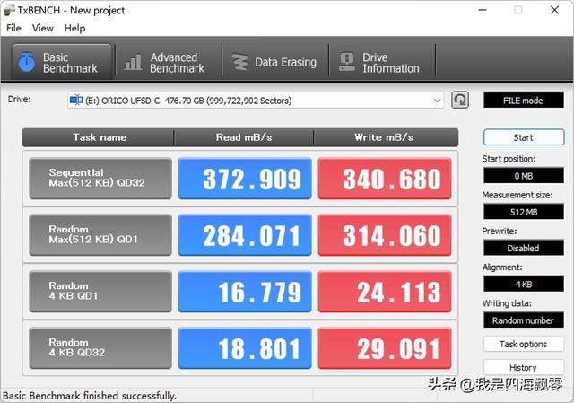 用TxBench测得数据,连续读取:372.909 MB/s,连续写入:340.680 MB/s。