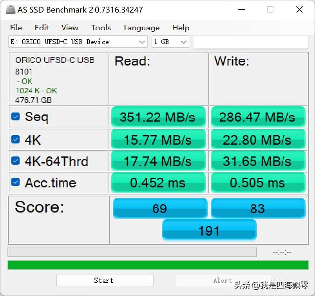 在AS SSD Benchmark测得数据,连续读取:351.22 MB/s,连续写入:286.47 MB/s。