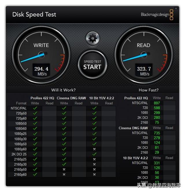 电脑用Disk Speed Test测得数据,连续写入:294.4 MB/s,连续读取:323.7 MB/s。