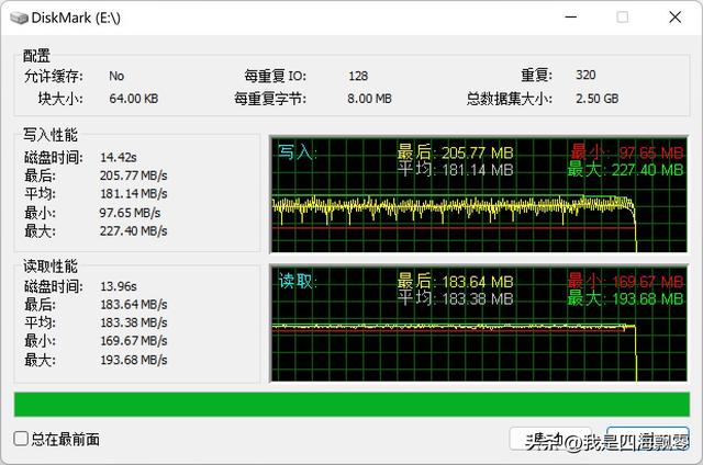 用DiskMark测得数据,写入性能最大:227.40 MB/s,读取性能最大:193.68 MB/s。
