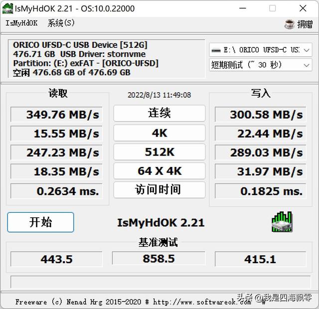 用IsMyHdOK 2.21测得数据,读取速度:349.76 MB/s,写入速度:300.58 MB/s。