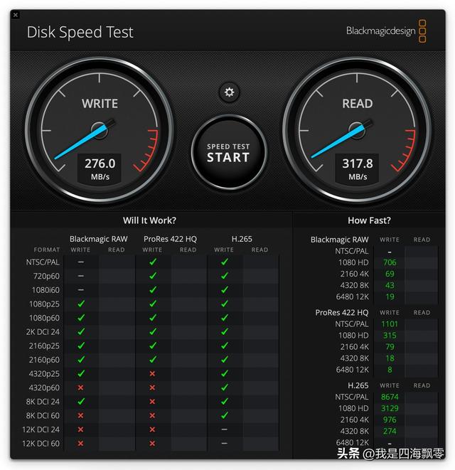 macOS系统测速用Disk Speed Test For Mac测得数据,连续写入:276.0 MB/s,连续读取:317.8 MB/s。