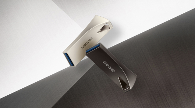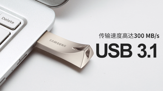 这里给大家推荐的是三星128GB BAR升级版+ U盘,与大家以往对U盘拼凑感外观的印象不同的是,这款U盘为一体成型设计,符合人体工学体验的流线外形让大家可以方便的插拔U盘,背部三角型开孔还能作为钥匙环以防丢失,好看而又坚固安全。金属质感带来优秀的手感,时尚的设计更是能够吸引同事的眼球。