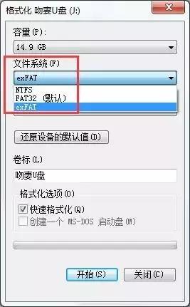 2、格式化前把文件系统选择:exFAT 或 NTFS 电脑(一般U盘格式默认为FAT32);