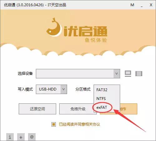 然后可能有些小伙伴的U盘是制作成了PE启动盘的,这种情况建议在制作时就选择exFAT,目前许多工具也开始支持exFAT格式制作了。